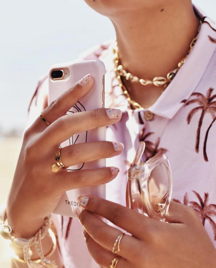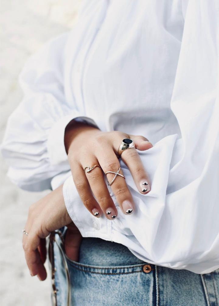 Hou je van een naturelle en minimalistische look? Breng dan op je ‘naakte’ nagel een subtiel detail aan, bijvoorbeeld een lijntje of een paar stipjes op een rij. Gebruik een basecoat of een semitransparante roze nagellak om je nagel te egaliseren.