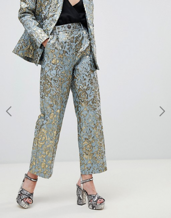 Grijsblauwe broek met gouden bloemenprint in jacquard