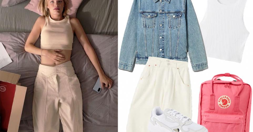 Het was moeilijk kiezen, maar wij hebben een outfit samengesteld die gebaseerd is op haar outfit uit de update van 3 september: een beige slouchy broek met croptop, chunky sneakers, een jeansjasje en natuurlijk mag een supervrolijke rugzak niet ontbreken! Welke van haar outfits is jouw favoriet?