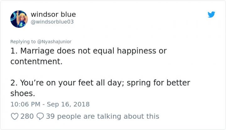 Het verleden kunnen we helaas niet meer veranderen, maar de toekomst hebben we gelukkig wel nog in de hand. Alleen kan het soms moeilijk zijn om bepaalde beslissingen te nemen als je bijvoorbeeld nog niet genoeg ervaring hebt. Daarom kan het helpen om raad te vragen aan een oudere generatie, en dat is precies wat Nyasha Junior deed op Twitter. Zij vroeg aan vrouwen van rond de veertig welk advies ze zouden geven aan zichzelf als ze twintig jaar jonger waren. Het aantal reacties dat ze kreeg, was overweldigend en wij hebben alvast een aantal van hun antwoorden op een rijtje gezet.