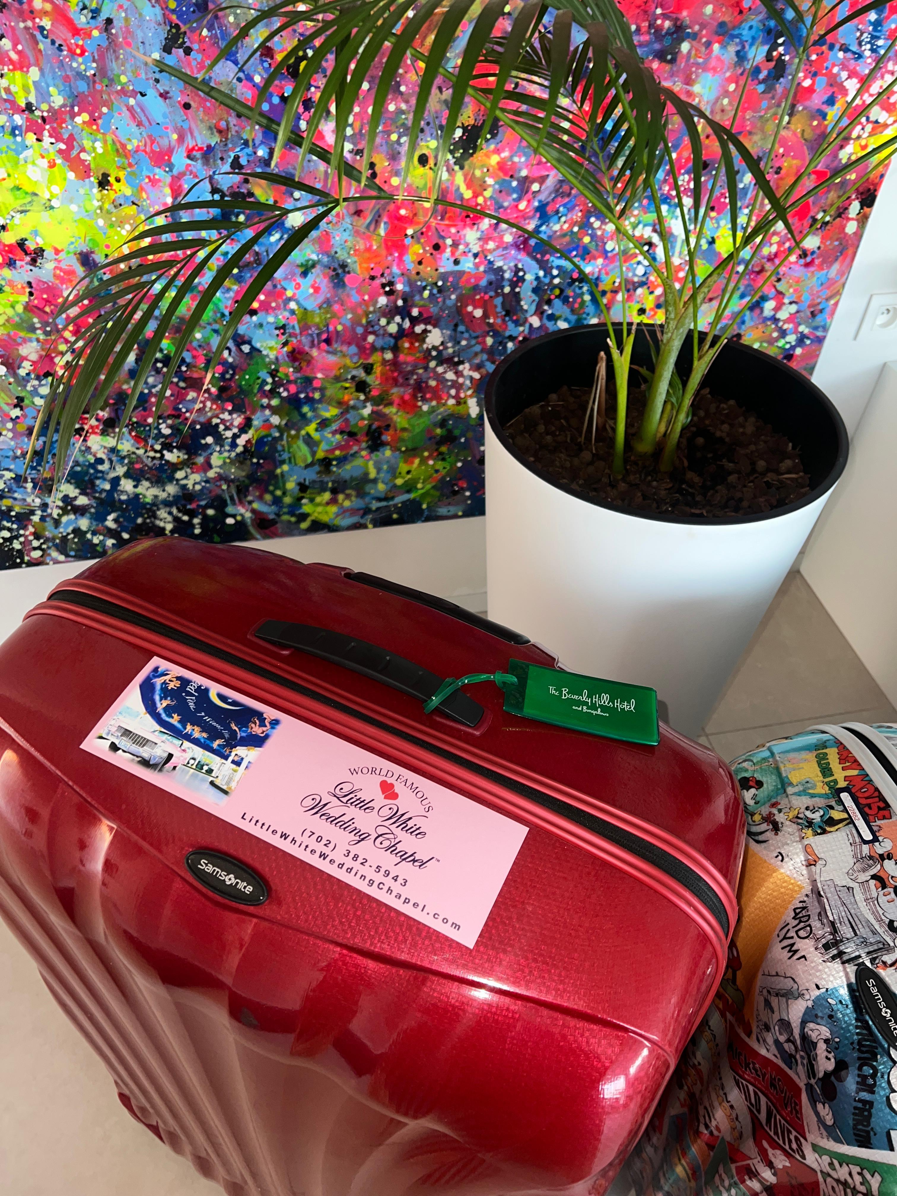 ‘We hebben als aandenken ook jetons waarop staat: married in Vegas. Ik heb daarnaast een rode Samsonite-koffer gekocht en heb daar een Little White Wedding Chapel-bumpersticker opgeplakt, waardoor ik altijd good vibes met mij mee heb op reis.’