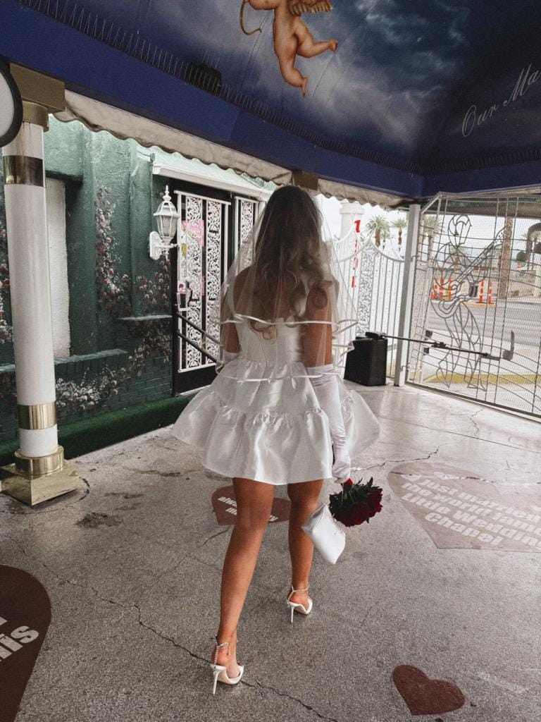‘We waren ons huwelijk aan het plannen toen we beseften dat we eigenlijk helemaal geen zin hadden in alle stress die bij zo’n trouwfeest komen kijken. Het móét zogezegd de mooiste dag van je leven zijn, en dat brengt veel druk met zich mee. Dat is dan ook de reden waarom we in Las Vegas zijn getrouwd. We kwamen er bijvoorbeeld maar niet uit wie we wilden uitnodigen. Je moet je cirkel klein houden, maar dat is bijna niet mogelijk. Je moet ook onmogelijke keuzes maken door te beslissen wie van je vrienden bruidsmeisjes en -jonkers mogen zijn en wie niet. Vanwege je trouwjurk, die je zo lang op voorhand kiest, mag je ook niet bijkomen of afvallen. Een of andere zatte nonkel geeft dan nog eens een bizarre speech… Dus hebben we er impulsief voor gekozen om een elopement (samen wegvluchten voor een intieme, geheime bruiloft, red.) te doen. We hadden het dus niet gepland, maar zijn gewoon in een periode dat voor ons allebei paste naar Las Vegas vertrokken en daar getrouwd.