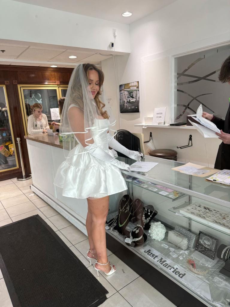 ‘In een andere kapel, de Sweethearts Chapel, kon je ook bruidsaccessoires kopen. Daar werkte een oud, klein, sympathiek vrouwtje met lange nepwimpers. Bij haar kocht ik voor zo’n zeventig dollar een sluier en mijn accessoires. Ik kreeg ook een oud, satijnen handtasje van haar cadeau, omdat ik “such a beautiful bride” was. Dat maakte het helemaal af. Toen René de andere zaken wilde betalen, zei ze ook: “That’s right, he better pay for it, that’s how a marriage should be!” Heel grappig.’