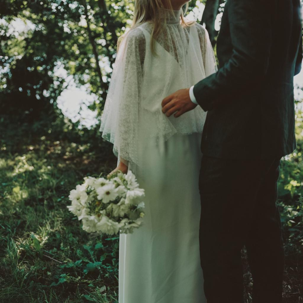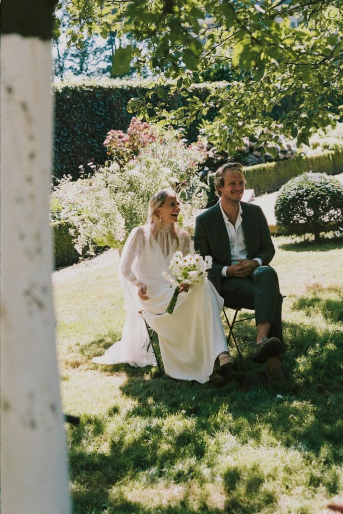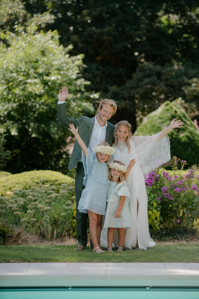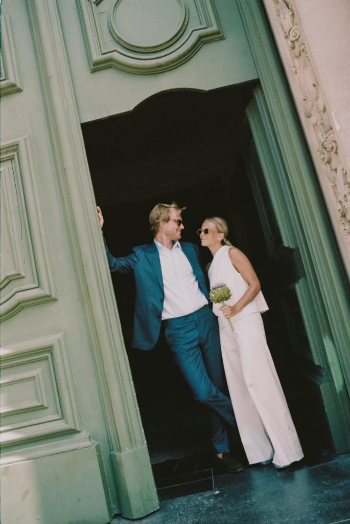 ‘Onze burgerlijke ceremonie vond de dag voor het grote feest plaats in de abdijtuin in Gent, een prachtige locatie waar we ons jawoord gaven. Mijn look bestond uit een toffe set van het Belgische Sea Me Happy in combinatie met een uiterst eenvoudig “boeket”: een prachtige artisjok uit de bloementuin van Boer Olivier. Na de ceremonie volgde een gezellige barbecue in intieme kring.’