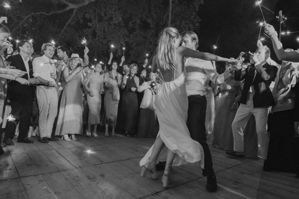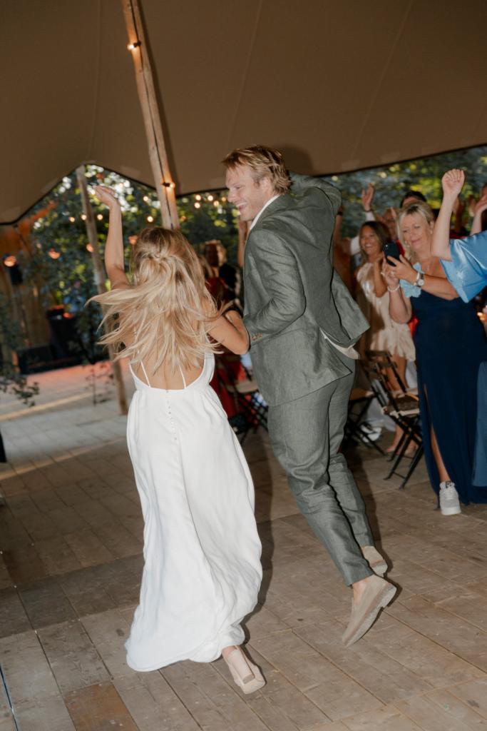 ‘Dj Juul Pence had de gasten tijdens het diner al warm gedraaid en lokte iedereen na het diner naar de dansvloer onder de gigantische rode beuk. Mijn papa, ook een (ex-)dj, nam het af en toe van hem over. Na halfuur dansen werd de openingsdans ingezet in het midden van de menigte, zodat de ambiance er al in zou zitten. We kozen voor Dan Hartmans “Relight My Fire” en voegden de daad bij het woord door alle gasten een vuurstokje toe te stoppen. Pure magie!’