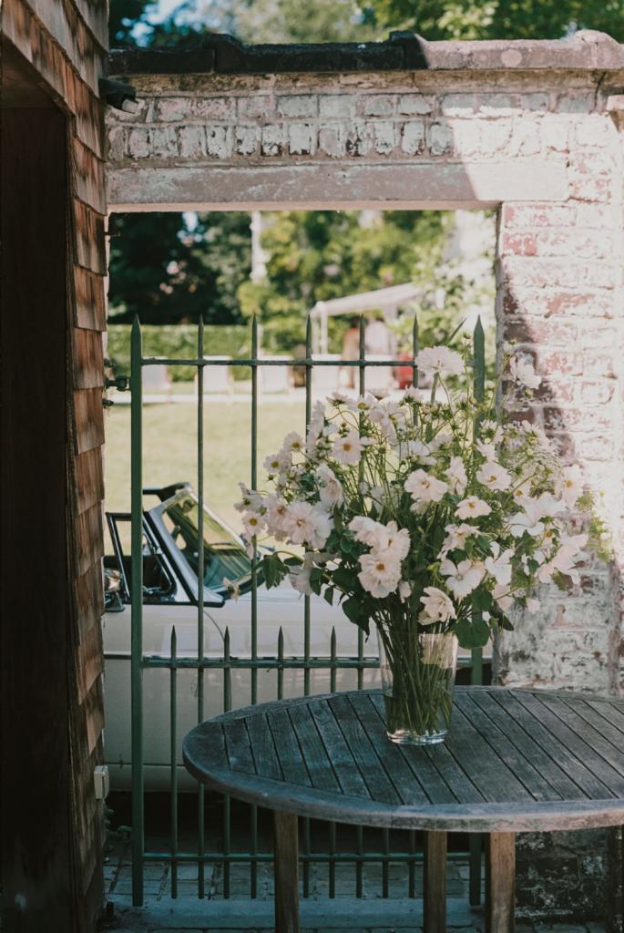 ‘Onze feestlocatie was de tuin van mijn schoonouders in Heusden. Aangezien er veel natuur aanwezig was, was het niet nodig om veel planten of bloemen aan het decor toe te voegen. Boer Olivier voorzag hier en daar wel enkele vazen met een mix van cosmos en andere witte bloemen, die perfecte pasten bij de sobere witte decoratie.’