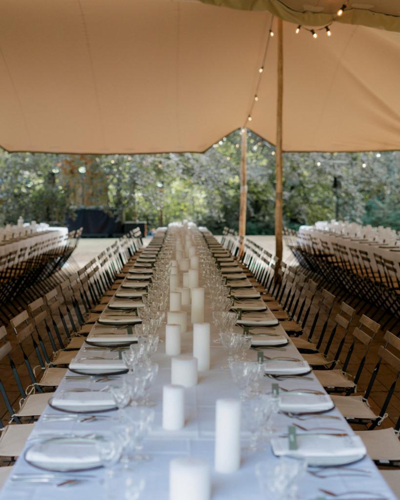 ‘De sobere decoratie werd doorgetrokken op de tafels, waar we kozen voor een overvloed aan witte kaarsen, die ’s avonds een gezellige sfeer creëerden. Bloemen waren niet nodig aangezien de tent sowieso omringd was door groen. Tenten Ghilles uit Kortrijk wist onze tent perfect in te passen tussen drie eeuwenoude bomen en creëerde zo een dansvloer onder de takken van een prachtige beuk.’