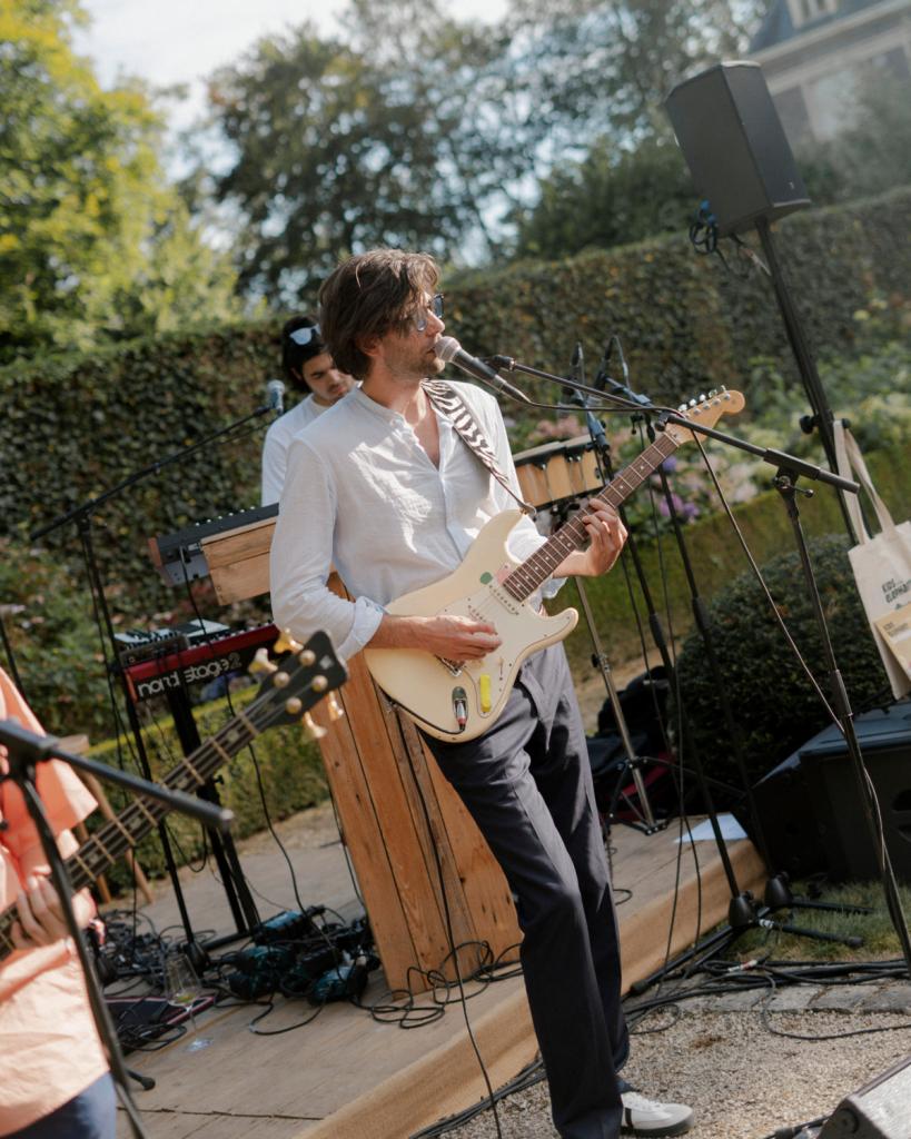 ‘Aangezien we de receptie tussen de ceremonie en het avondfeest planden, besloten we een band in te huren om de sfeer er wat in te blazen. Al snel kwamen we terecht bij Kids of the Elephant, een groovy band uit het Brusselse die hun eigen nummers schrijven en waarvan Simon en ik grote fan zijn. Tot slot brachten ze ook een aantal bekende nummers die iedereen kon meezingen.’