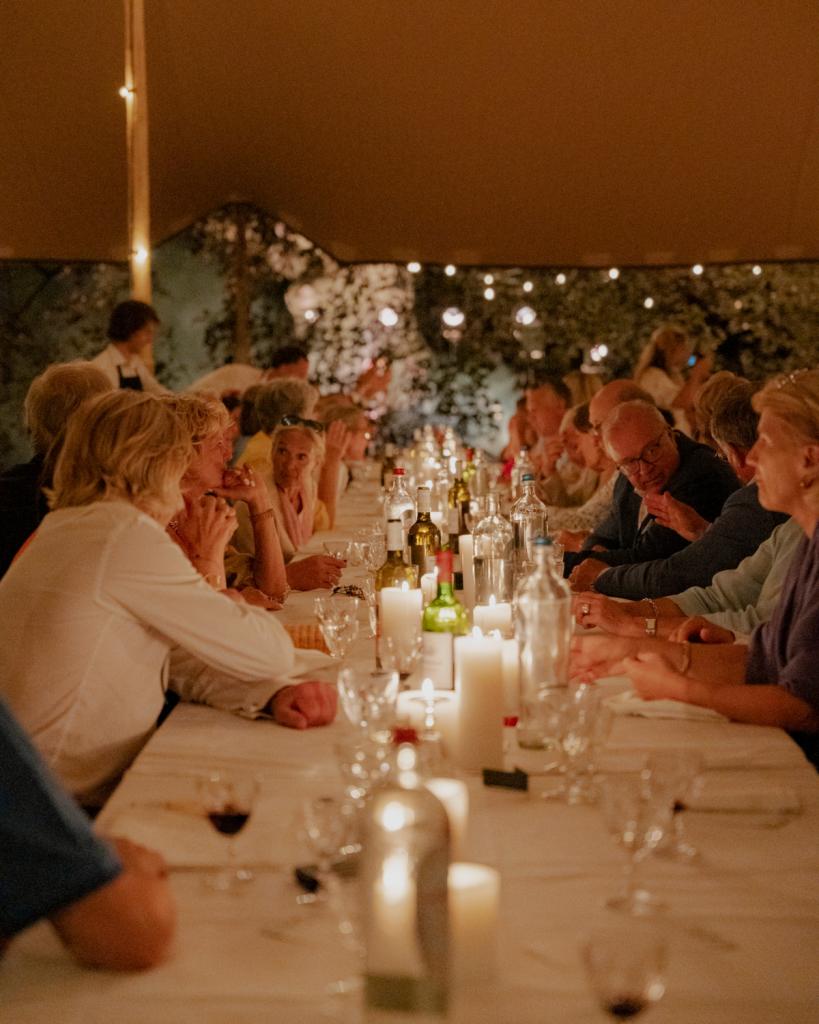 ‘We hadden geluk met het weer. De bomen boden schaduw tijdens de intieme ceremonie in de boomgaard. Mijn beste vriendin heeft prachtig gezongen, terwijl Simons beste vriend de ceremonie feilloos heeft geleid. Na de receptie met de fantastische band Kids of the Elephant was het tijd voor het diner in een met lampionnen verlichte stretchtent.
