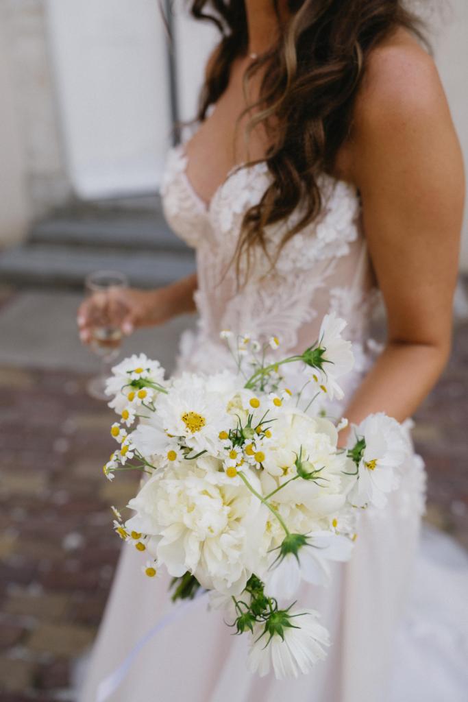 ‘De bloemen kwamen van Jorun Huybrechts in Kasterlee. We kozen voor frisse witte kleuren met groen. Classy en tijdloos.’