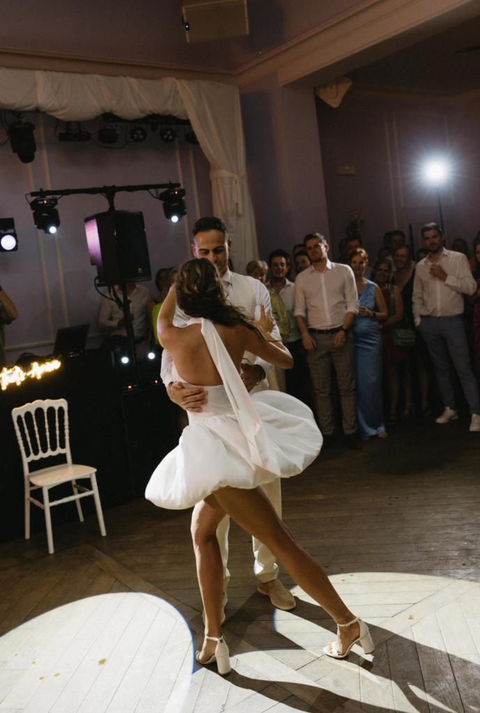 ‘Onze openingsdans deden we op “Someone You Loved” van Lewis Capaldi en “Suavemente” van Elvis Crespo als verrassend einde. We besloten tien dagen voor de trouw te starten met danslessen om een choreo in te studeren voor onze openingsdans! Mijn avondjurk is van het merk Balykina. Mijn hakken van Stuart Weitzman.’