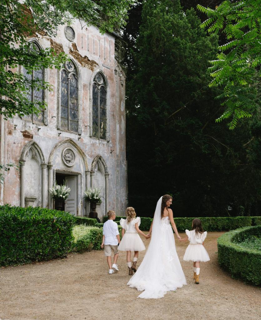 ‘We kozen ervoor om onze mete- en petekinderen te kiezen als onze bruidskindjes: Amélie, Axelle & Lewis. Ze vonden het fantastisch om bruidskindjes te zijn op deze leuke dag.’