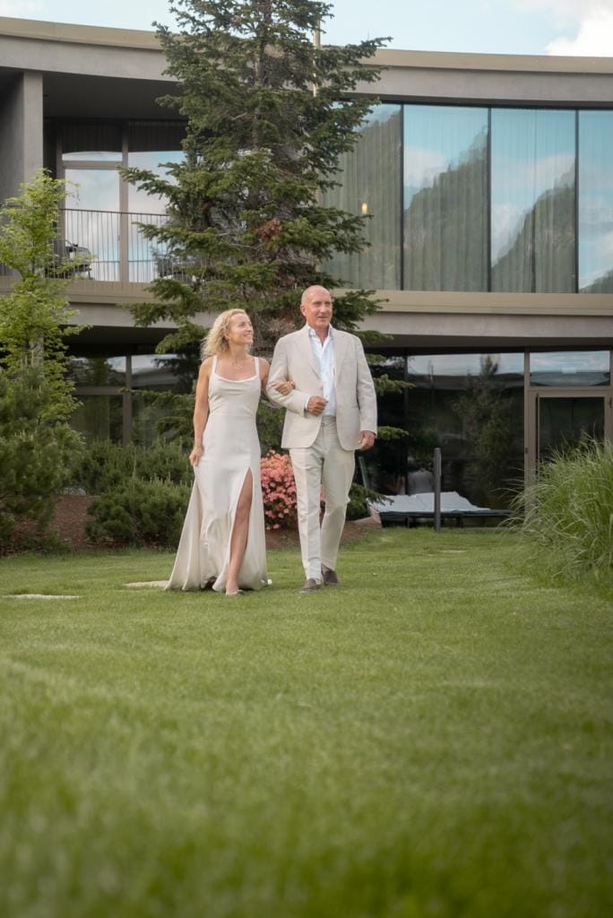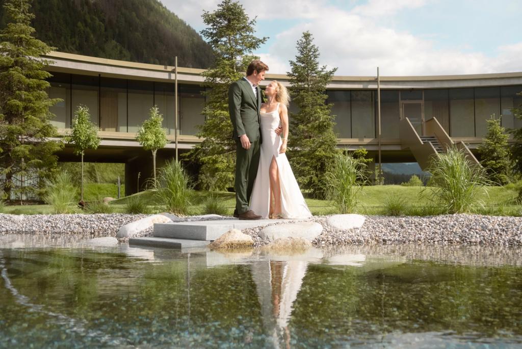 ‘In een intieme kring van twintig personen hebben we onze trouw nadien gevierd in de Italiaanse bergen in ons favoriete hotel OLM Nature Escape. Zaterdagnamiddag kwam iedereen aan en hebben we een glaasje gedronken aan het zwembad, waarna we een eerste casual dinner met de groep hadden. De sfeer zat direct goed en de groep klikte vanaf het eerste moment. Zondag was de echte feestdag. Deze begon met een feestelijk gezamenlijk ontbijt met als dresscode pyjama. Na het ontbijt trokken we de bergen in voor een zonnige hike, het zou immers niet ons weekend zijn als het niets van sport bevatte. De hike eindigde in een berghut, die heel romantisch versierd was met allemaal houten hartjes, met prachtig uitzicht op de vallei waar we met een Aperol Spritz klonken en genoten van kaiserschmarrn (Oostenrijkse pannenkoek, red.) en aperoplankjes. Na de wandeling kon iedereen even ontspannen in de wellness van het hotel, waar we tot 25 minuten voor de ceremonie nog in bikini aan het zwembad zaten.