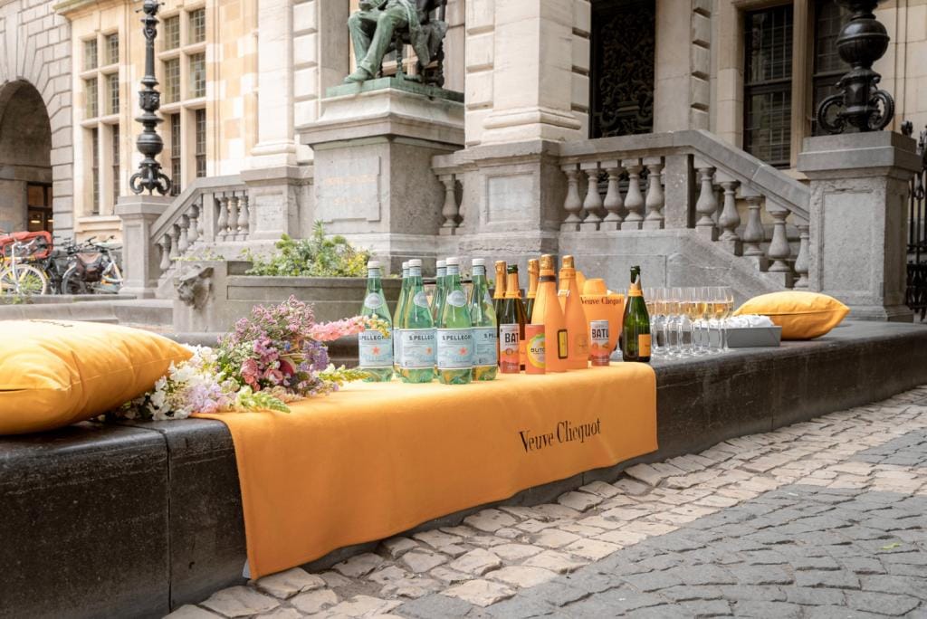 ‘Na de formaliteiten op ‘t Schoon Verdiep dronken we een glaasje op het Hendrik Conscienceplein. De drank werd door Yannigs broer met een bakfiets tot daar gebracht terwijl wij met de suite, vrienden en onze hondjes naar het plein wandelden.’