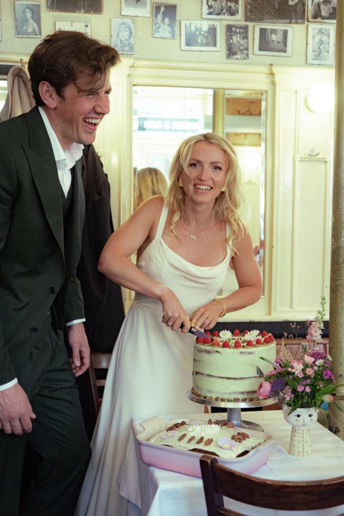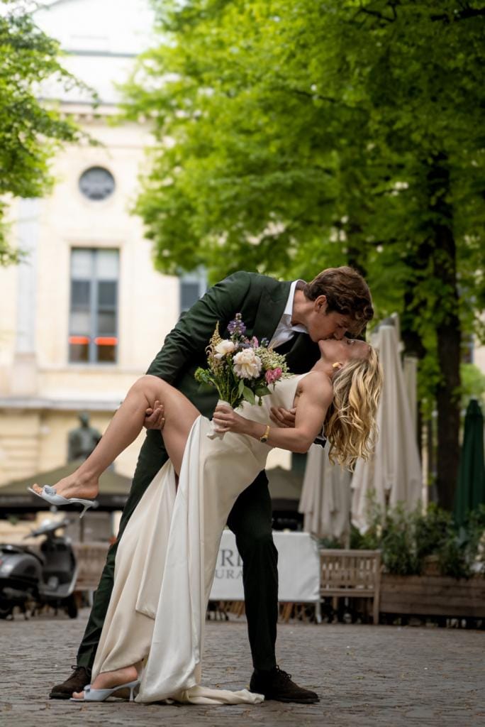 ‘Slechts drie maanden voor de trouw vond ik mijn jurk van Prea James op een sample sale bij The Ivory Club. Het was immers te laat om ergens een jurk te bestellen en ik had het geluk dat er nog net genoeg tijd was om er een hoge split in te laten stikken. De look werd afgemaakt met slip-on muiltjes van Lola Cruz, een wit wollen vestje van Sézane en goudkleurige bloem-oorbellen van Diamanti Per Tutti. Yannig liet zijn kostuum in donkergroen op maat maken bij TOD-B.’