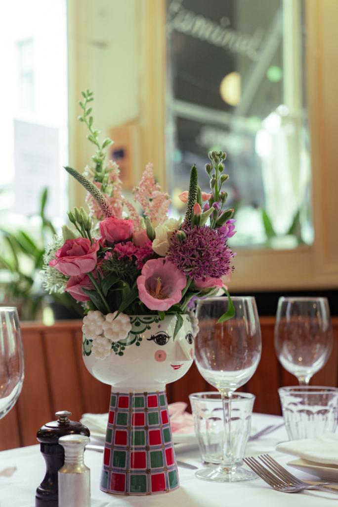 ‘De bloemen en het bruidsboeket voor het burgerlijke feest werden verzorgd door onze favoriete bloemist – Bloemen Van Den Bulck – die we kennen van op de zaterdagmarkt in Antwerpen. Mijn ouders zijn marktkramers en wij woonden zelf ook enkele jaren vlak naast de markt in Antwerpen, dus het was leuk om die persoonlijke tint in de aankleding te verwerken. De leuke vaasjes van Bjørn Wiinblad kochten we zodat deze herbruikt konden worden tijdens de receptie.’