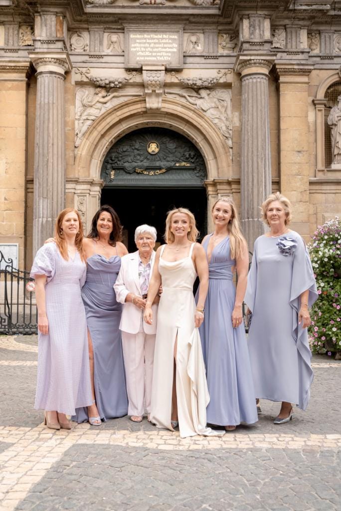 ‘Mijn getuigen, mama’s en mijn bomma kozen voor een lilakleurige lente-look. Ik had voor het kleurenthema lila/saliegroen gekozen, dus het was wel schattig om ze allemaal matching in lila te zien.’
