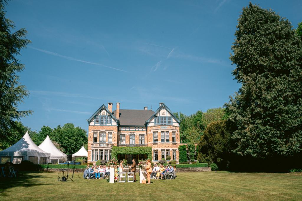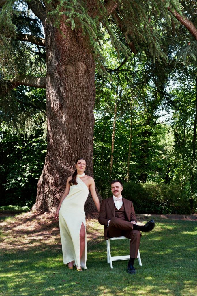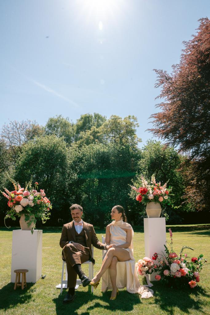 ‘Voor onze ceremonie wilden Jules en ik het graag intiem houden. Alleen met onze allerliefsten erbij. Omdat de zon volop scheen, besloten we het in de tuin van het domein te doen. Zalig gewoon! Op “Come & Get Your Love” van Redbone ging de ceremonie van start, en gaf mijn papa me weg... Een moment om nooit te vergeten. Samen met Julie van Expéri’eau hebben we alles voorbereid. Ze nam de tijd om ons te leren kennen en liet ook onze mama’s en beste vrienden meeschrijven aan ons verhaal. Op de dag zelf bracht Katrijn, Julies collega, ons verhaal tot leven, precies zoals wij het wilden. Tussen haar woorden door waren er ook prachtige speeches van onze beste vrienden, onze mama’s én natuurlijk: onze geloften aan elkaar. Onze ceremonie was zó wij: warm, oprecht, met veel gelach en hier en daar een traantje. We sloten af met Umberto Tozzi’s “Gloria” en een Aperol Spritz in de hand.’