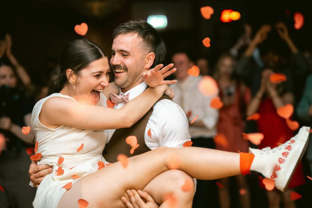 ‘Na een lange zoektocht kozen we uiteindelijk voor “Can’t Take My Eyes Off You“ in de versie van Boys Town Gang als ons openingsdansnummer. We wilden absoluut iets met pit om op te swingen. Alleen kunnen Jules en ik helemaal niet swingen. Enter: choreografe Lisa Van Braeckel, die ons met veel geduld de basics aanleerde. Haar danslessen waren trouwens de perfecte quality time in de drukke aanloop naar de bruiloft. Twee maanden voor de grote dag kregen we nog een kleine paniekaanval: Jules scheurde z’n kruisband op skireis. We vreesden dat het een klassieke slow zou worden, maar gelukkig was hij nét op tijd weer genezen. Vlak voor de dans wisselde ik snel van outfit: ik had de trouwjurk van mijn mama laten aanpassen naar mijn maat en kon niet wachten om het te dragen op het dansfeest. En toen barstte het feest los. Met onze vriend Dries, beter bekend als dj Daddycate, achter de draaitafel, stond de dansvloer de hele avond vol. Wat. Een. Feest!’