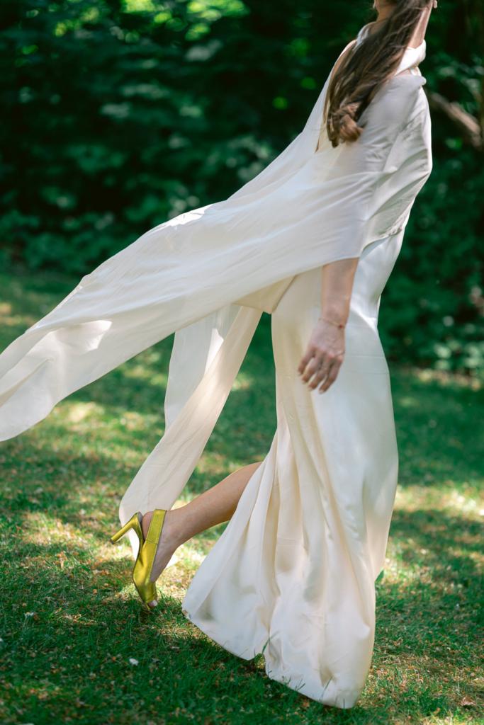 Voor het avondfeest gooide ik het over een andere boeg: ik switchte naar een tweede jurk. De originele trouwjurk van mijn mama, die ik liet aanpassen naar mijn stijl, mét open rug voor die extra toets. De hakken gingen uit, de sneakers van Converse aan. Klaar om te feesten, volledig partyproof!’