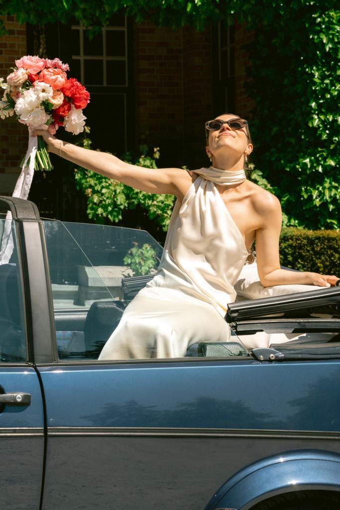‘Klassiek zijn Jules en ik allesbehalve, maar toch besloten we de avond voordien apart te slapen, gewoon om de spanning erin te houden. Jules bleef thuis met zijn broer en beste vrienden, ik sliep nog eens in mijn oude kamer bij mama en papa. ‘s Ochtends kwam Jules me ophalen in zijn oude Golf Cabrio, want de first look vond plaats bij mijn ouders. We hadden géén idee hoe de ander eruit zou zien… Dat zorgde natuurlijk voor een flinke portie emoties, een magisch, onvergetelijk moment vol traantjes (en verwondering)!’