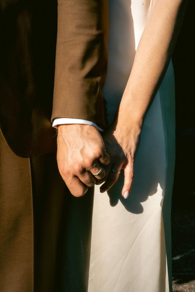 ‘Jules hoefde niet lang te zoeken naar de perfecte verlovingsring. Al snel kwam hij terecht bij Line Vanden Bogaerde in Gent, en haar stijl sprak hem meteen aan. Wat het helemaal af maakte? Haar persoonlijke aanpak én het feit dat ze enkel werkt met fairmined (100 % eerlijk, red.) goud en diamanten, daar was hij meteen fan van. De ring was zó mooi dat we geen seconde twijfelden: onze trouwringen moesten ook van haar hand komen. En wat een goeie keuze was dat!’