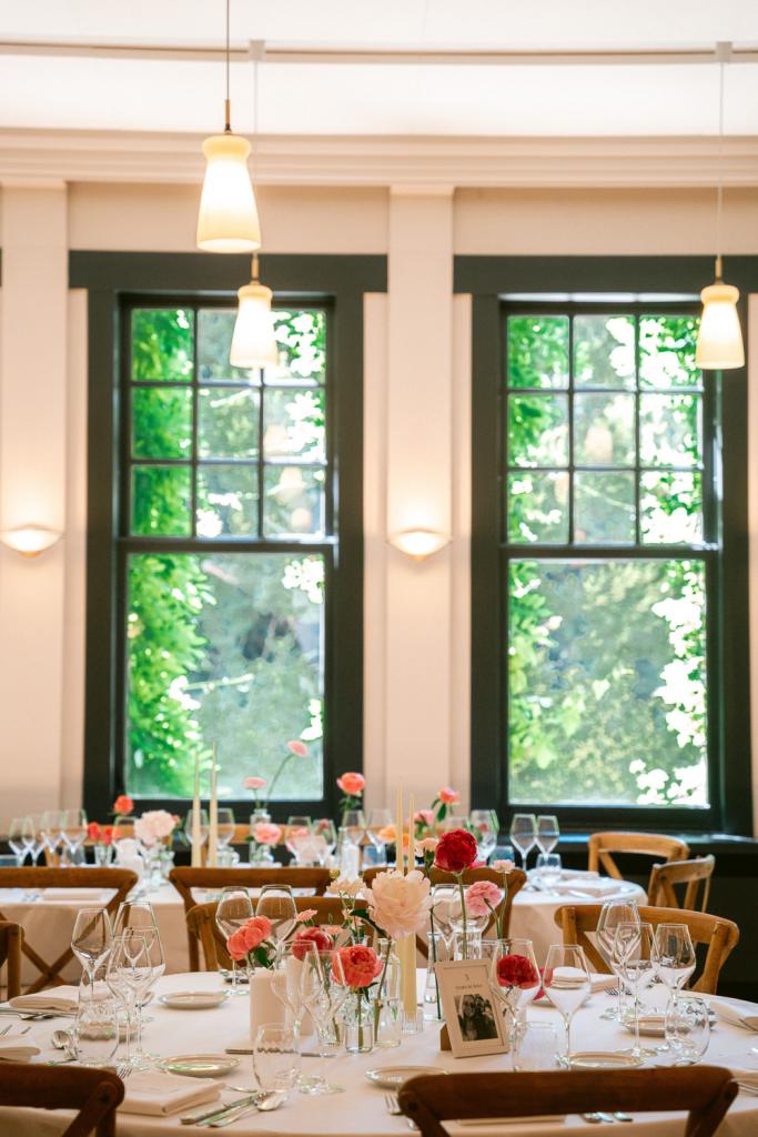 ‘Ook voor de bloemetjes kozen we voor bright & colorful met heel wat roze tinten. We kozen voor een subtiele styling waarbij je oog vooral naar de bloemetjes getrokken werd. Deze stonden voor mij qua styling ook centraal aangezien ikzelf heel graag bloemen zie. Sofie, onze bloemiste, heeft deze boodschap heel goed begrepen en maakte er iets supermooi van! Het drukwerk maakte ik zelf en hield ik heel minimalistisch in dezelfde stijl als onze save the date en uitnodiging. Voor de tafelnummers had ik telkens een foto genomen van het aantal jaar dat we samen waren op dat moment. Dus tafel één was bijvoorbeeld een foto van toen Jules en ik één jaar samen waren.