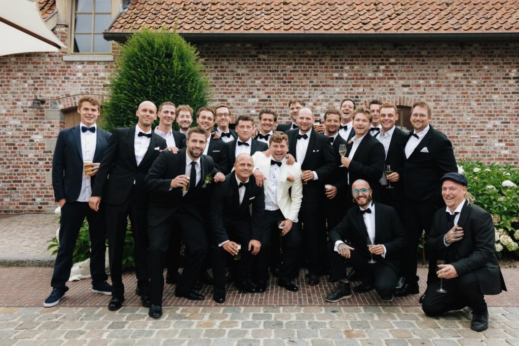 ‘Ik was al wakker om 4u30 en startte de dag met krachttraining bij mijn ouders – een vertrouwd begin. Mijn vriendin hielp me met haar en make-up, wat ik enorm apprecieerde. De zenuwen waren groot bij de first look. Dat moment was intens, maar daarna voelde ik me helemaal ontspannen. We begonnen met een walking lunch als receptie. Om 17u vond de ceremonie plaats bij een vijvertje in de velden van Kooigem – puur en prachtig.