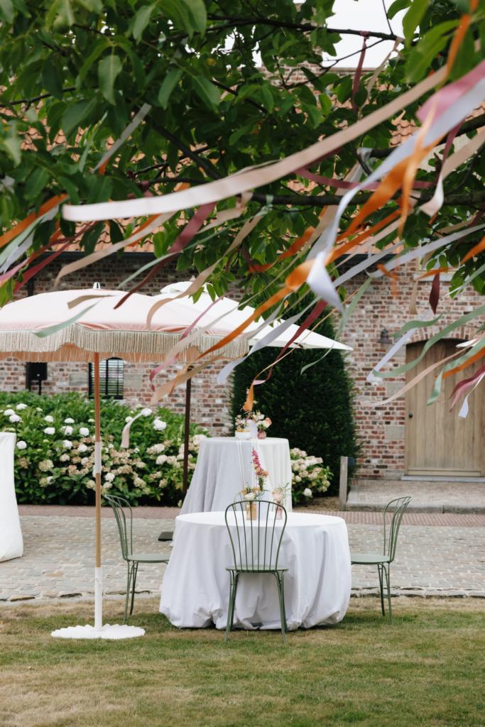 ‘We kozen voor tafels en parasolletjes buiten. Er hingen overal kleurrijke lintjes en die kwamen ook terug in mijn bruidsboeket, fleurig en vrolijk.’
