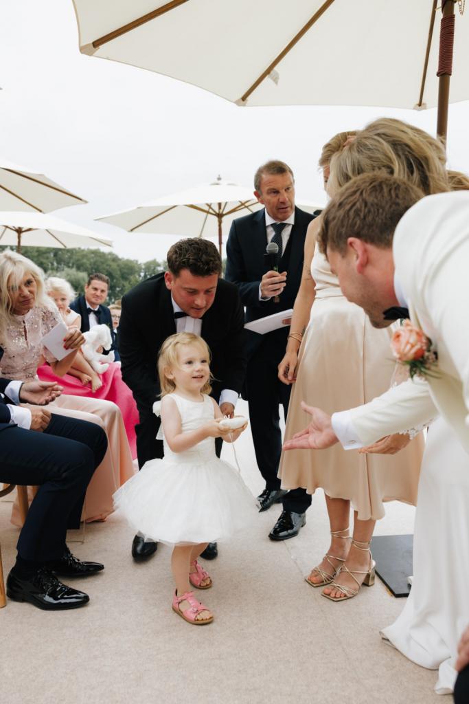 ‘Onze kleine schat Anna bracht de ringen naar voren tijdens de ceremonie en werd daarbij begeleid door haar Peter Lucas. Ze heeft dat superflink gedaan.’
