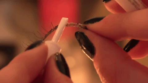 Mark our words, als je de wimpers op je ooglid duwt meteen nadat je de lijm erop hebt aangebracht zullen ze heen en weer schuiven en zal het onmogelijk zijn om ze op de juiste plaats te kleven. Breng de lijm aan op de wimpers, wacht minstens 30 seconden en kleef de wimpers pas dan op je ooglid, zo dicht mogelijk tegen de wimperrand. De lijm heeft dan de tijd gehad om al wat harder te worden een kleeft net genoeg om meteen vast te hechten aan je huid.