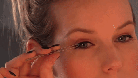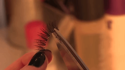 Er bestaan speciale applicator tools om het aanbrengen van valse wimpers makkelijker te maken. Heb je dat niet in huis, dan raden we aan om een gewone pincet te gebruiken om de uiteinden eerst plaatselijk vast te zetten. Knijp de pincet vervolgens dicht en gebruik ze om de volledige wimperrand aan te duwen.