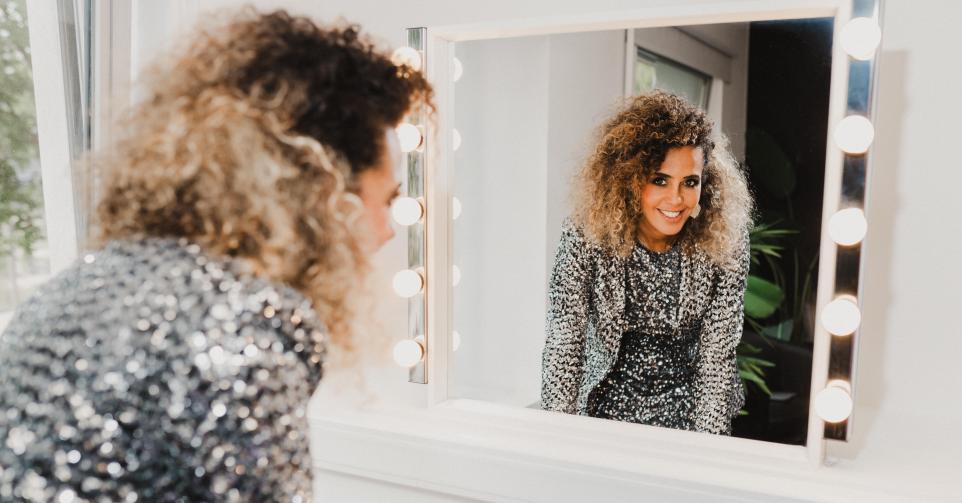 ‘Ik probeer te accepteren wie ik ben en mezelf volledig te omarmen. Ik vond het vroeger verschrikkelijk dat niemand in de make-up de juiste producten meehad voor mijn huidskleur of dat ze niet wisten wat ze moesten aanvangen met mijn krullen. Ik werd daar heel onzeker van en ik zat vaak huilend in de auto terug naar huis. Als ik nu een fotoshoot heb of een programma presenteer, dan zeg ik op voorhand met wie ik wil samenwerken, punt. Dat is niet om de diva uit te hangen, maar puur uit zelfliefde, want ik weet dat zij me wel goed zullen laten voelen en doen stralen.’